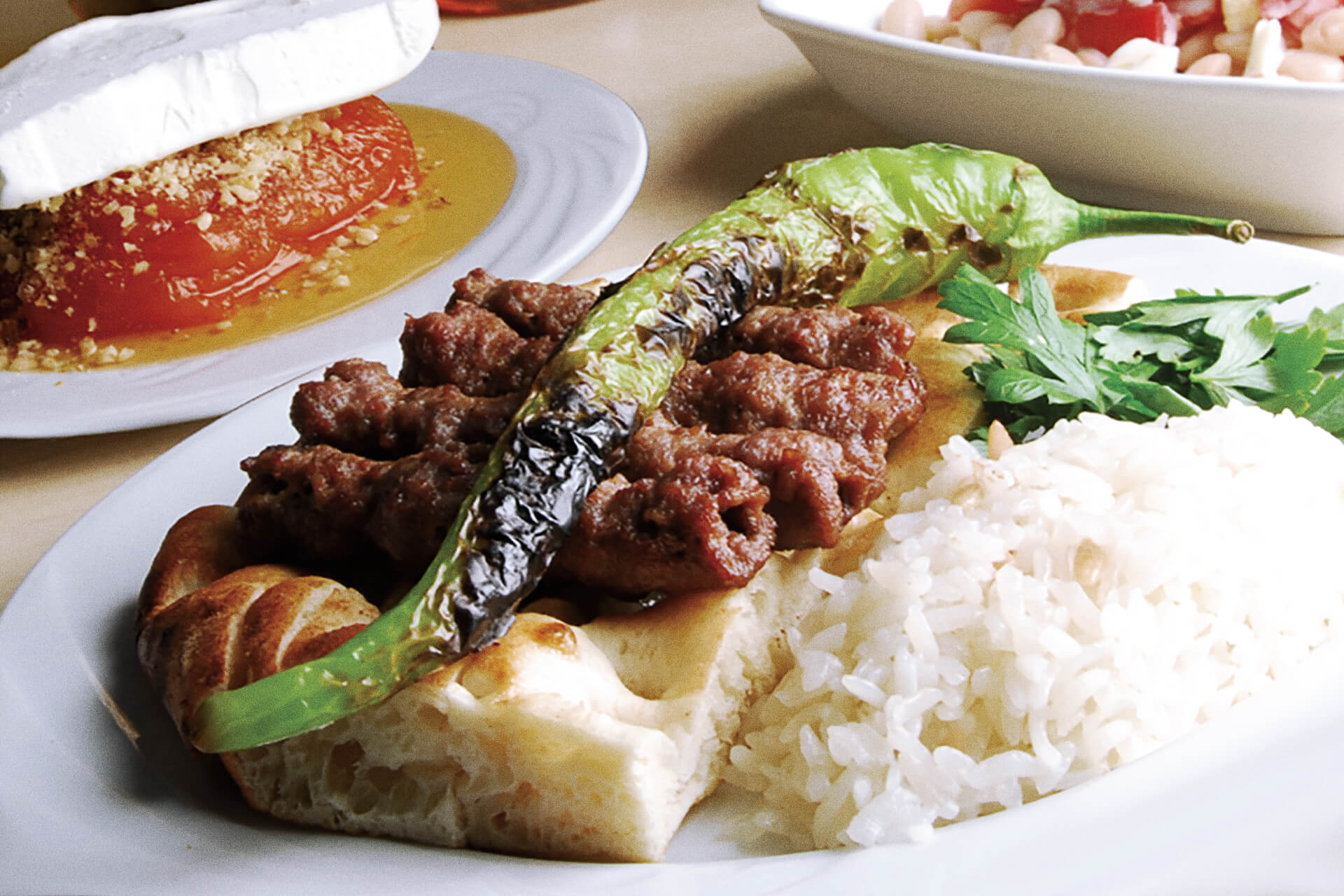 Dana köfte, biber, domates, pilav ile servis edilir.